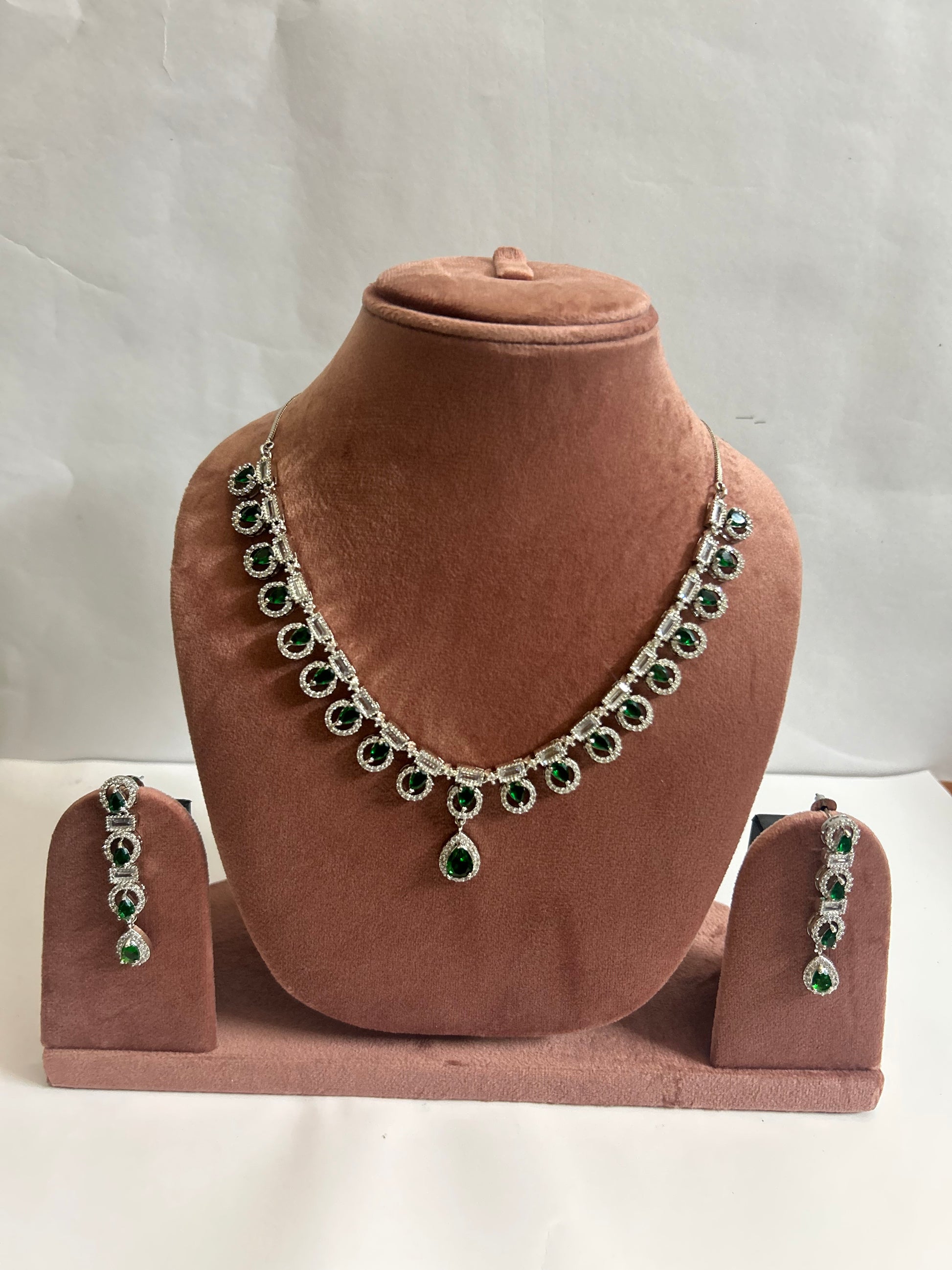 Sparkling Silver-Tone Necklace Set with Green Stones