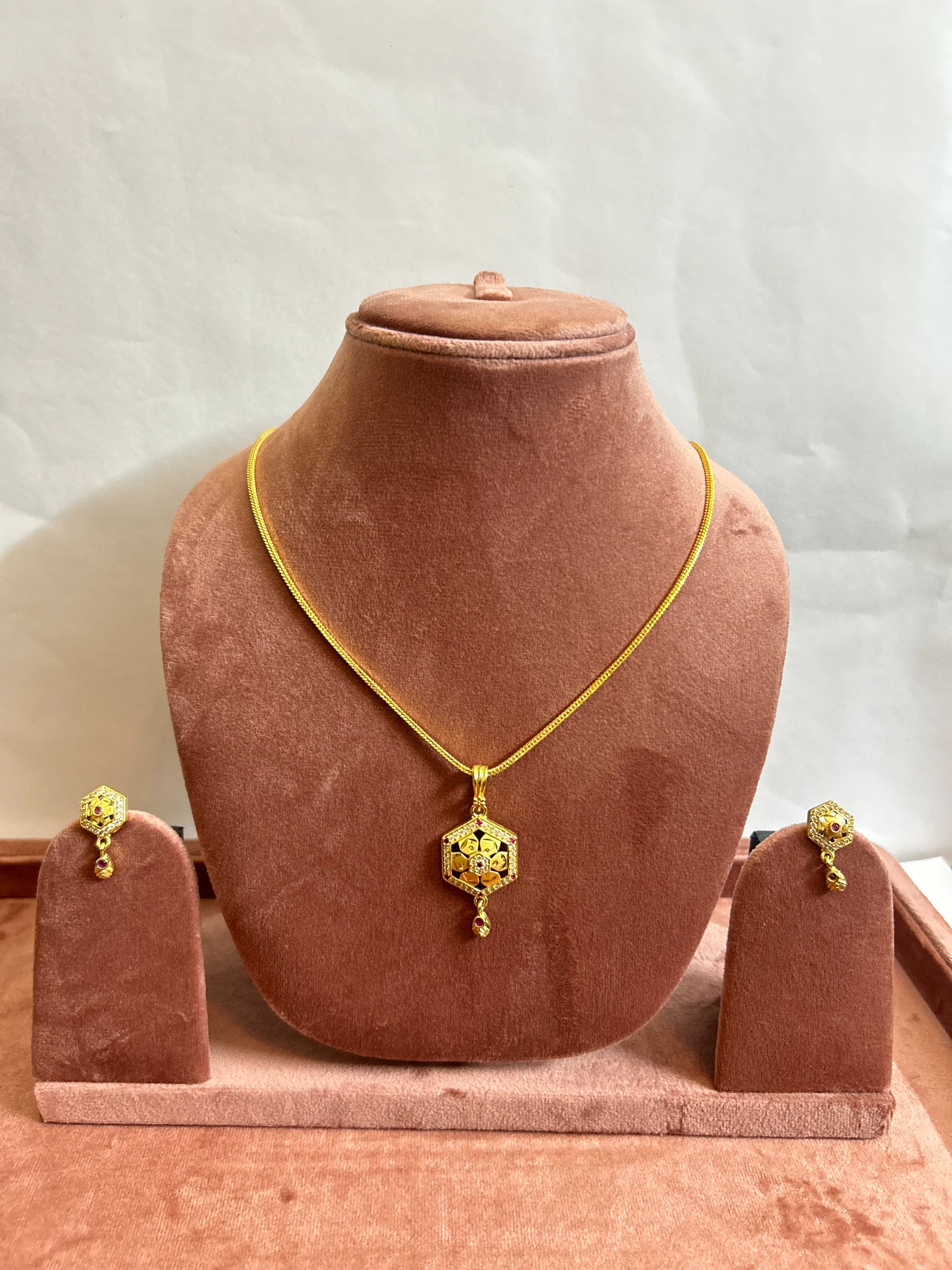 Elegant and timeless, this gold-tone necklace set features a beautifully crafted hexagon-shaped pendant adorned with intricate detailing and red stone accents. Paired with matching drop earrings, this set is perfect for weddings, festive celebrations, and special occasions.